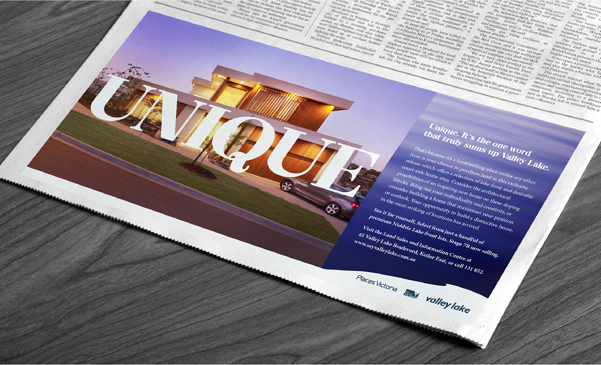 Places Victoria, the Victorian Governments Property Development Agency, appointed Blaze to assist in selling the final 60 remaining residential land lots at Valley Lake, a prestigious residential estate 18km north of Melbourne in Keilor East. Our research team conducted one-on-one in-depth interviews with residents, as well as those yet to build, those that had sold their lots and builders with experience designing and building properties at Valley Lake. Based on the insights in to the target audience, we developed and implemented a disruptive marketing campaign, consisting of a premium brochure, press advertisements, electronic direct mail, outdoor signage, redesigned website and online digital advertising.
